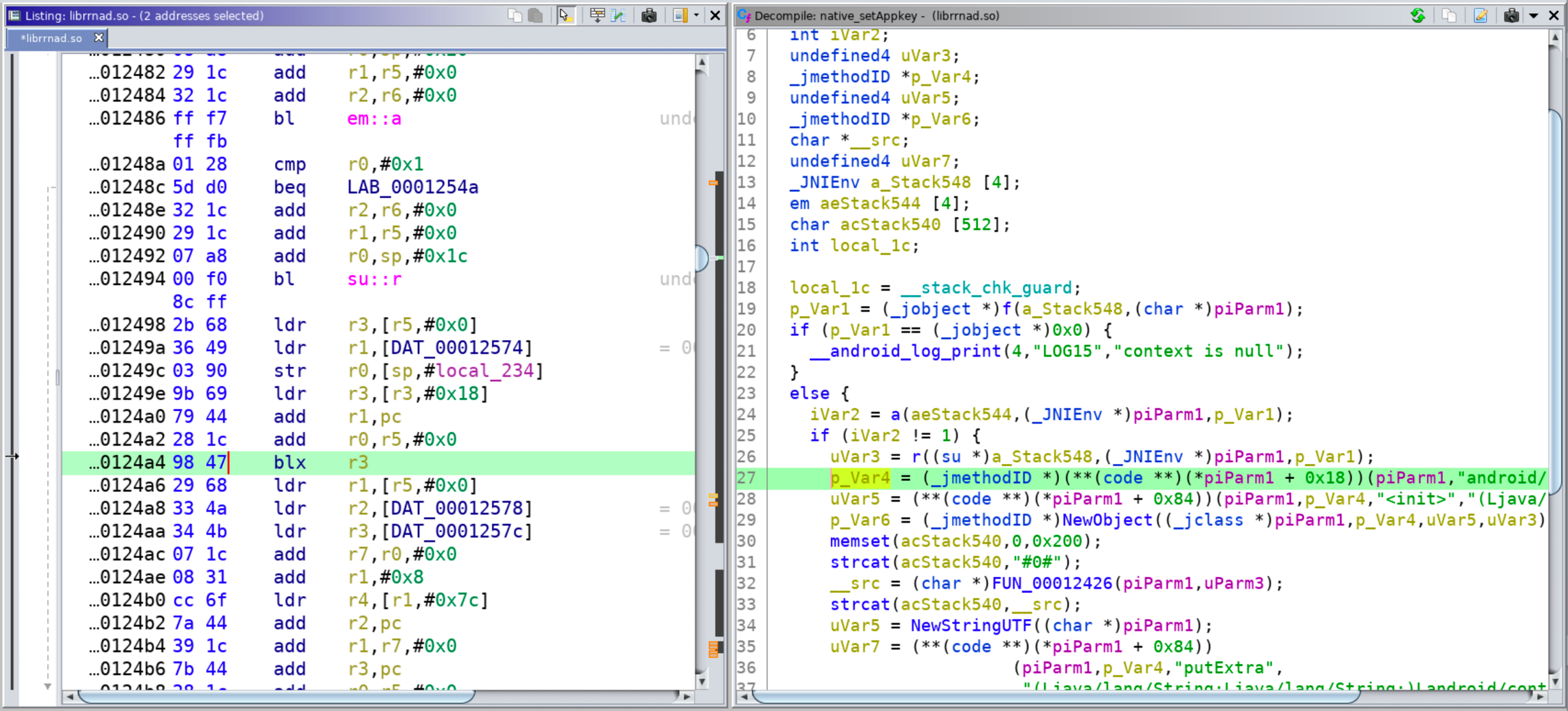 In practice, in the disassembly this shows as many different branches to indirect addresses rather than the direct function call. The image below shows one of these indirect function calls. The highlighted line in the disassembly shows a blx r3. As reversers, we need to figure out what r3 is. It’s not shown in the screenshot, but at the beginning of this function, r0 was moved into r5. Therefore, r5 is JNIEnv*. On line 0x12498 we see r3 = [r5]. Now r3 is JNIEnv (no *).
