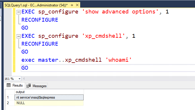 The extended stored procedure xp_cmdshell spawns a Windows command shell and executes the string passed to it, returning any rows of text. This command is run as the SQL Server service account.