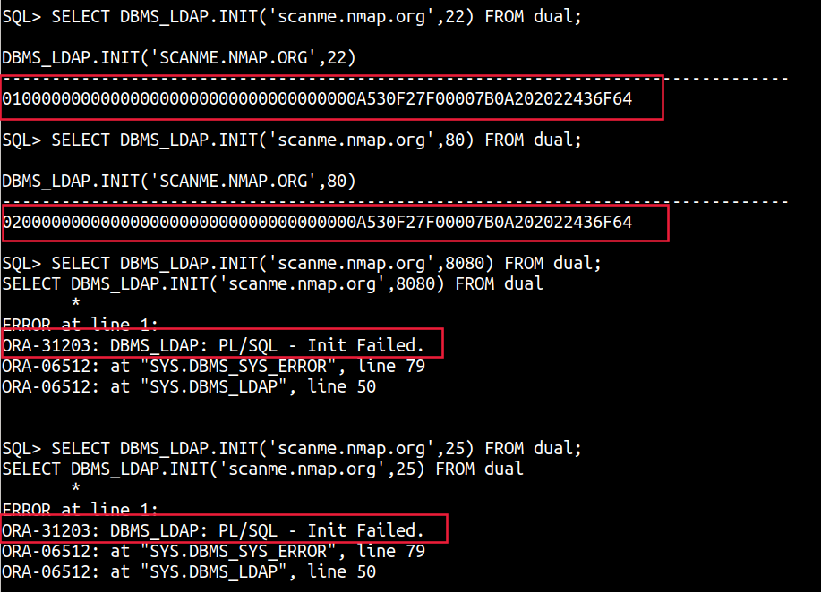 site:docs.oracle.com inurl:"/database/121/ARPLS" "host"|"hostname" "port"|"portnum"The search returned the following results (not all can be used to perform outbound network)