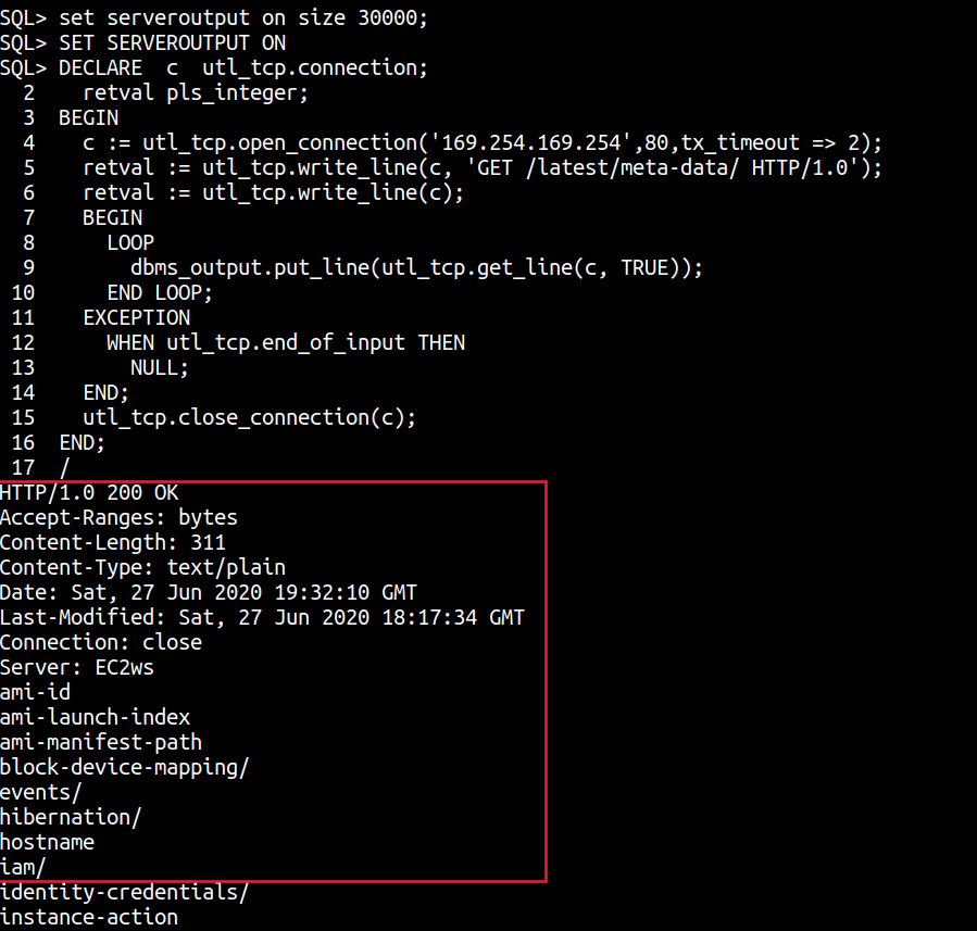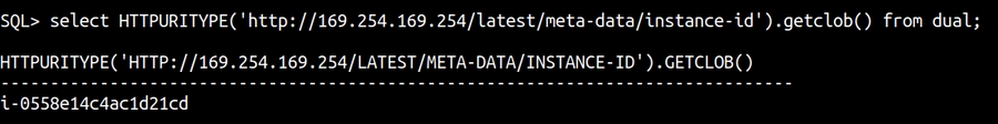 Another package I have used in the past with varied success is the GETCLOB() method of the HTTPURITYPE Oracle abstract type that allows you to interact with a URL and provides support for the HTTP protocol. The GETCLOB() method is used to fetch the GET response from a URL as a CLOB data type.select HTTPURITYPE('http://169.254.169.254/latest/meta-data/instance-id').getclob() from dual;