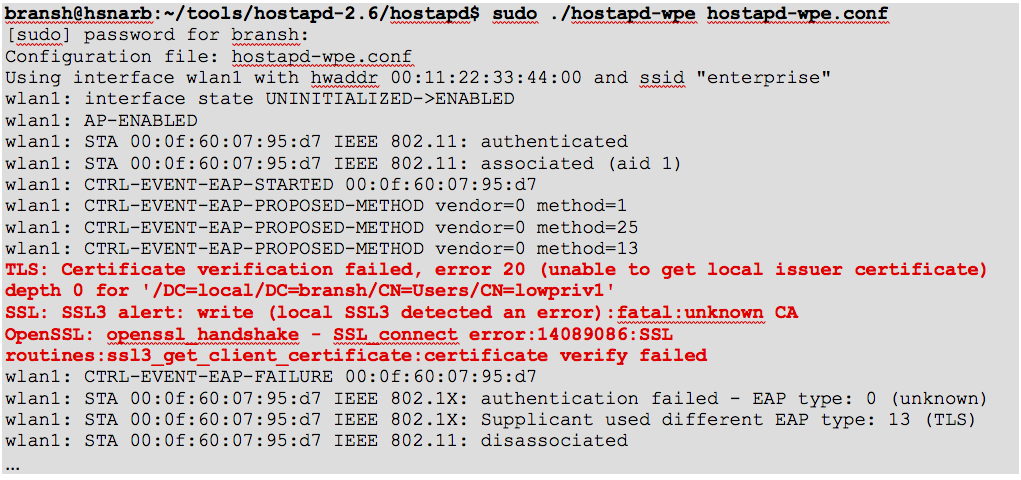 As you can see in the error message, our tool is triggering an error message indicating it did not accept the certificate of the Wireless client because it is signed by an unknown CA. Hilarious, right? Our attacking tool is denying access to the victim because the user is not providing valid credentials. 🙂