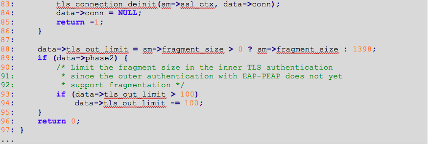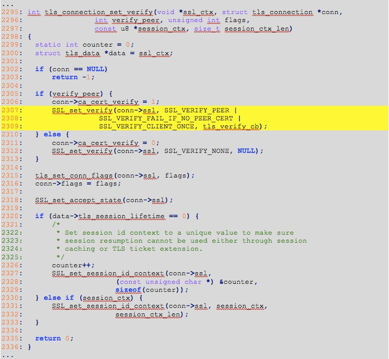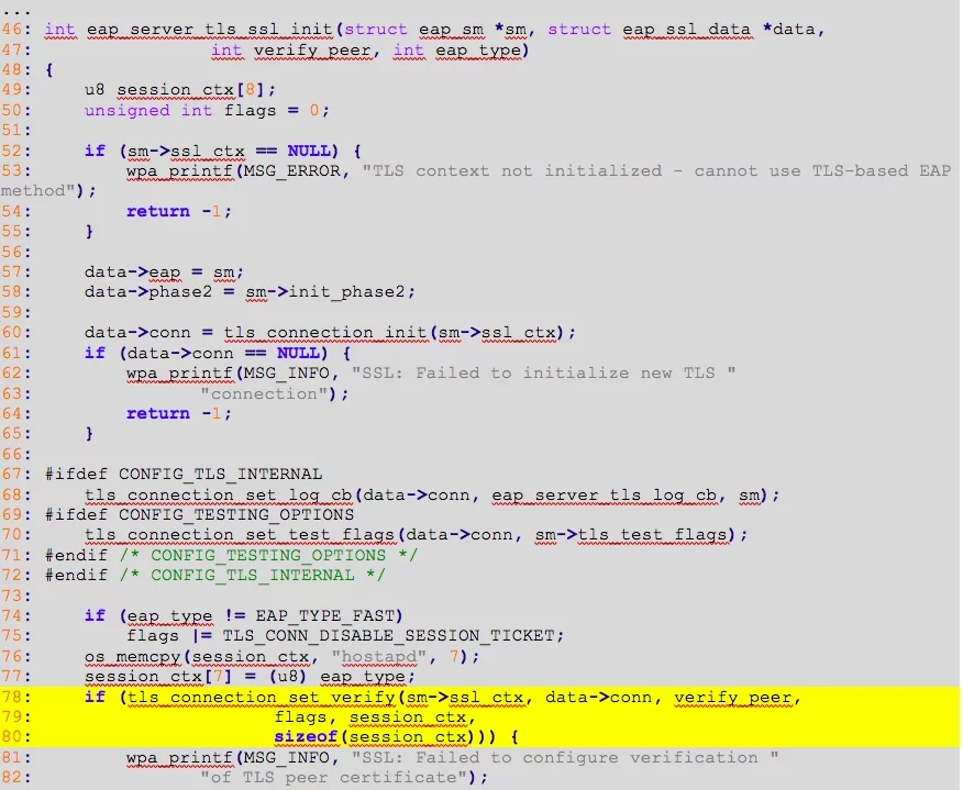In the code above (lines from 78 to 80), we can observe the invocation of the function tls_connection_set_verify with the parameter verify_peer set to 1 (this was received from the eap_tls_init function).