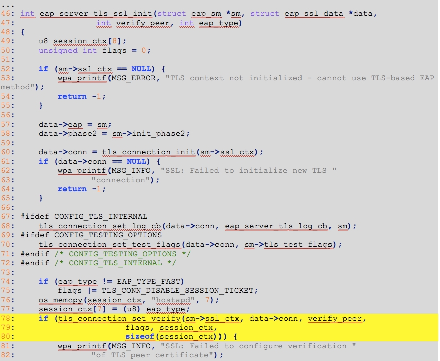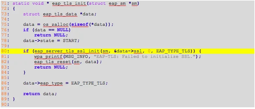 As you can see in the code above (line 80), the EAP TLS server implementation on hostapd invokes a custom function named eap_server_tls_ssl_init to initialize the server, and the third parameter is set to 1.