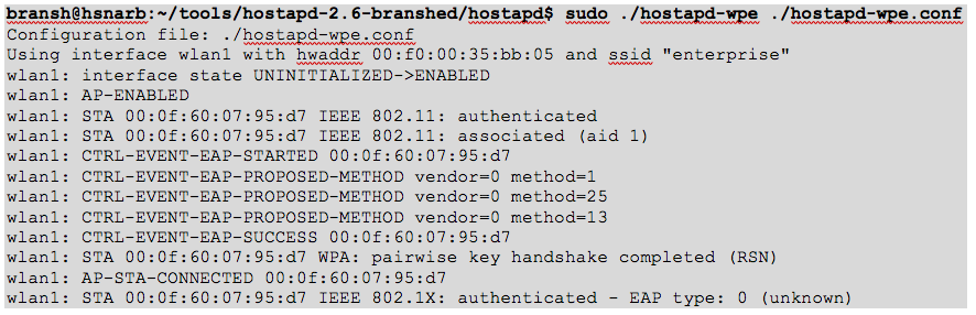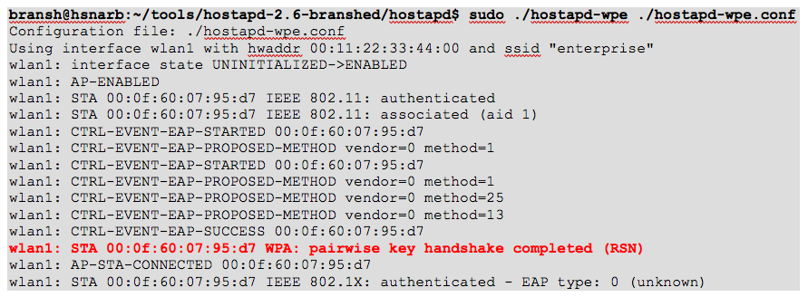 As a result, we will see on the modified hostapd-wpe tool’s output the following messages: