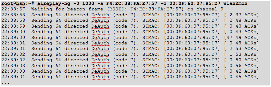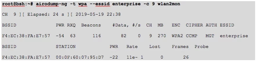 From the output, we can identify the access point BSSID (F4:EC:38:FA:E7:57) to which our victim (00:0F:60:07:95:D7) is connected to the WPA2-enterprise network named “enterprise” (ESSID).