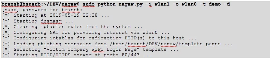 After the victim has entered her credentials, we can see the output on the captive portal’s console:
