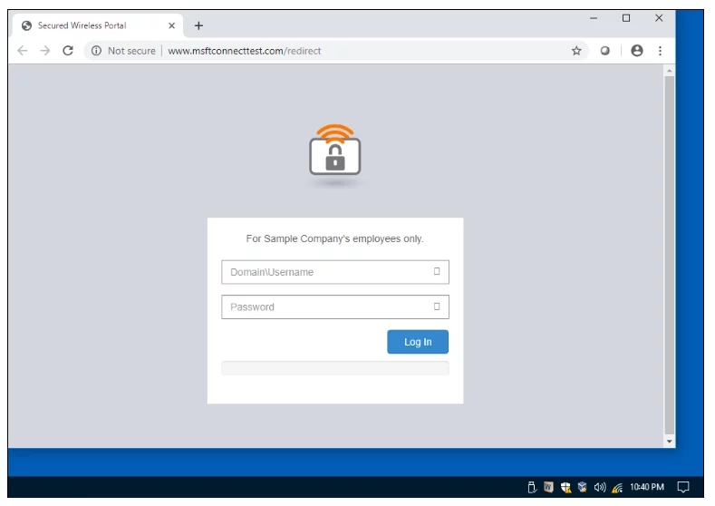 On the victim’s Windows host, we observe it automatically connected to the fake AP, and as soon as web navigation is tried, the user is presented the captive portal: