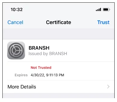 The following screenshot shows the message shown to the victim when performing the attack to an iPhone device connected to a WPA2 network, requesting the victim to accept the certificate: