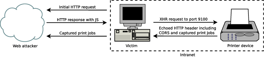 You can use XMLHttpRequest (XHR) JavaScript objects as defined in to perform HTTP POST requests to internal printers. A limitation of the cross-site printing approach discussed so far is that data can only be sent to the device, not received because of the same-origin policy. To bend the restrictions of the same-origin policy, you can make the server responds with a fake but valid HTTP response allowing CORS requests (including Access-Control-Allow-Origin=* ). A schematic overview of the attack is given below: