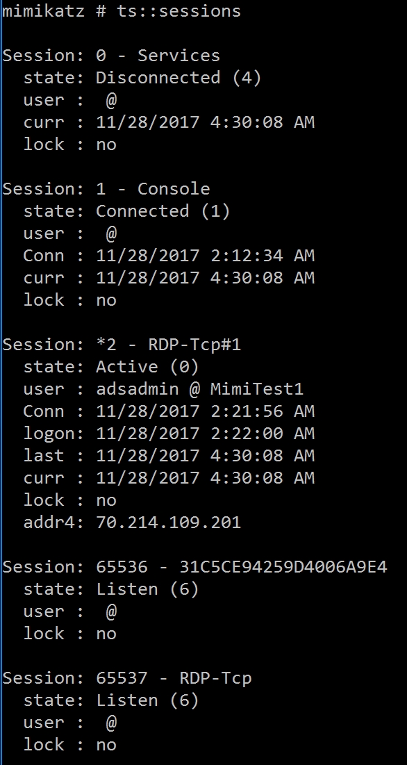 SEKURLSA::Tickets – Lists all available Kerberos tickets for all recently authenticated users, including services running under the context of a user account and the local computer’s AD computer account. Unlike kerberos::list, sekurlsa uses memory reading and is not subject to key export restrictions. sekurlsa can access tickets of others sessions (users).
